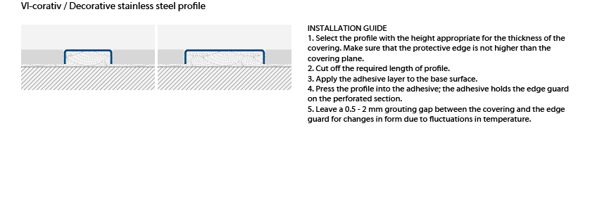 The complexity and beauty of the VI-corativ SSDF profile are ideal for those people who think in the long term because the profile’s durability means it will outlast all other profiles made of different materials. It is resistant to damage, chemical, mechanical, weather stresses, and it is equally suitable from safety and hygiene aspects due to its professional surface treatment. The decorative, modern style shiny-patterned profiles and the more restrained, elegant hairlined-satined effect are perfectly asserted for both tiling and carpeting.